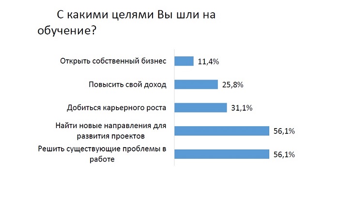 Исследование показало, что большинство респондентов отправляются на обучение, чтобы решить существующие проблемы в работе (56,1%) и найти новые направления для развития проектов (56,1%). Карьерного рост волнует 31,1% респондентов, увеличение доходов – 25,8%, а открытие бизнеса – 11,4%.
