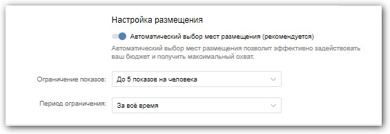 Завершающий пункт — выбрать места размещения рекламы (мобильная или десктопная версия сайта, приложение) и частоту показов: